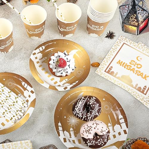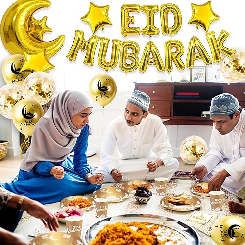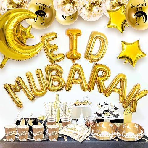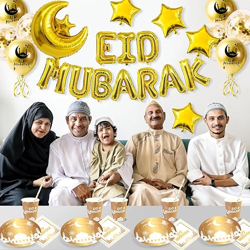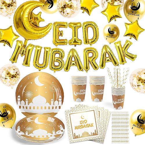 iZoeL Vaisselle Eid Mubarak Jetable Decoration Aid Moubarak 2023 Or Banderole Ballons Serviettes Assiettes Tasses Paille - Jardin Maison Restaurant