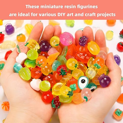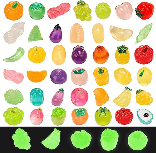 60 pcs Mini Figurines Lumineuses Fruits Légumes, VEINARDYL Résine Miniatures Artificielles Fruits Légumes Brillent dans Le Noir, Décoration Alimentaire Miniature Fausse l'Artisanat DIY Jardin Maison