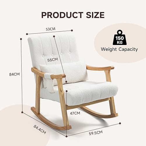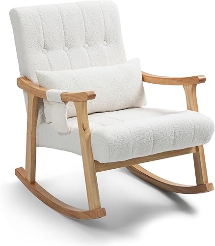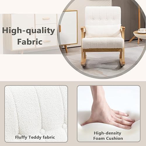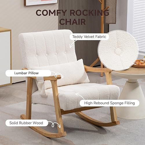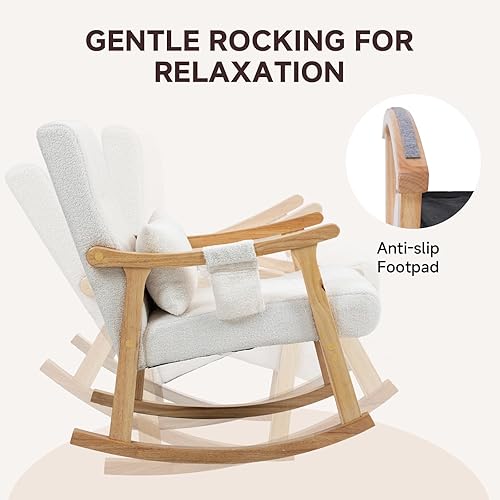EROMMY Fauteuil à Bascule, Fauteuil de Relaxation en Tissu Teddy avec Coussin Lombaire & Poche Latérale, Rembourré en Tissu Doux, avec Cadre en Bois de Caoutchouc, pour Salon, Chambre à Coucher, Blanc