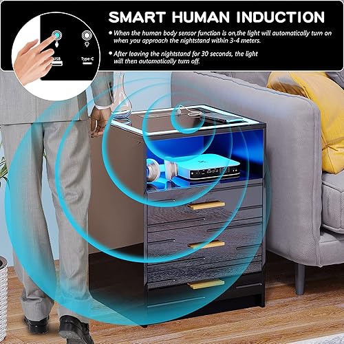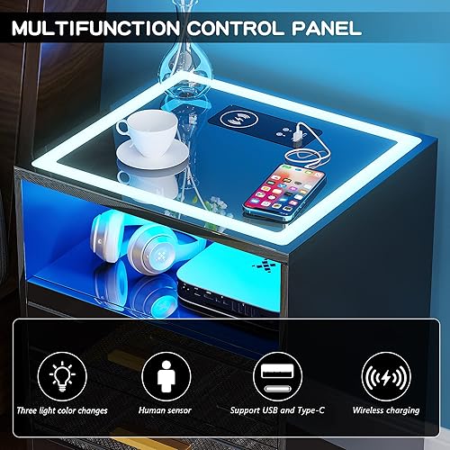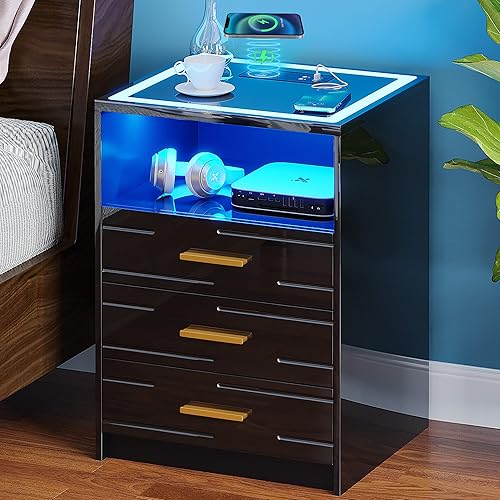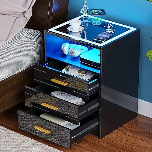 Lvifur LED Table de Chevet avec Station de Charge sans Fil,Table de Nuit Brillante avec écran Tactile,Armoire de Chevet avec 3 tiroirs et Charge USB/Type-C Convient pour Le Salon et la Chambre