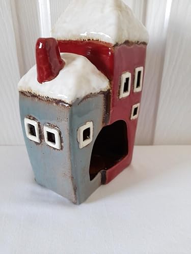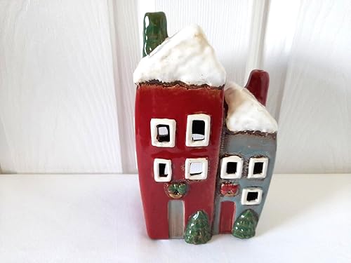 Photophore de Noël avec deux maisons de campagne Rouge/gris Village Pottery