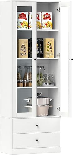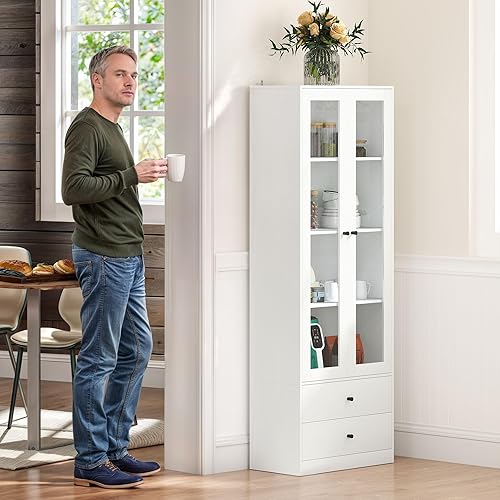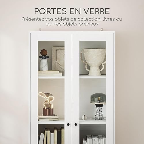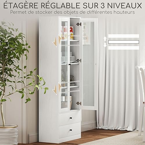 HOMCOM Meuble de Rangement Buffet Salon avec Placard à Portes vitrées, étagères réglables et 2 tiroirs, Armoire de Rangement pour Salon, Cuisine, Chambre, 59 x 30 x 164 cm, Blanc