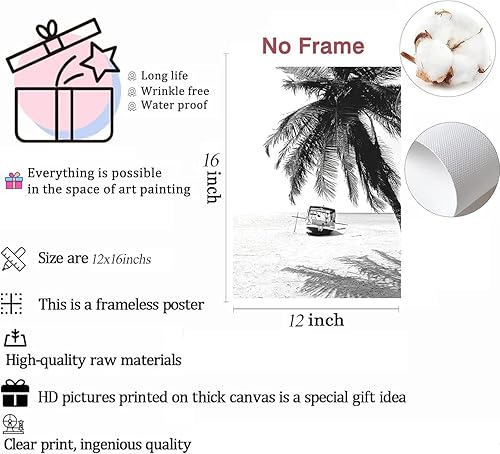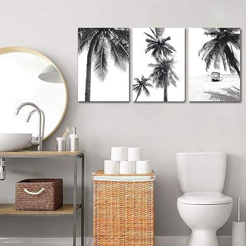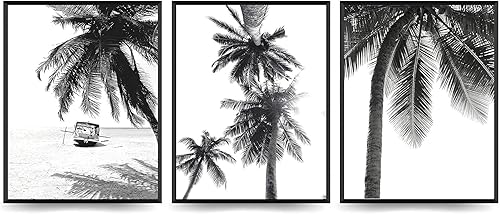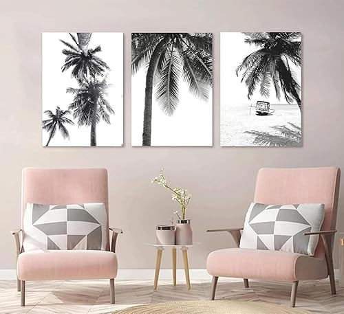 Linilioart Lot de 3 toiles murales en noir et blanc avec palmiers tropicaux, paysage de plage tropicale, œuvre d'art contemporain nordique botanique pour salon, sans cadre (30 x 40 cm)