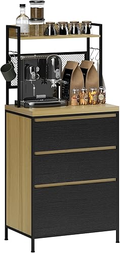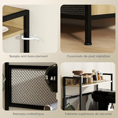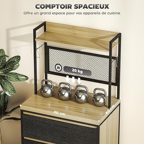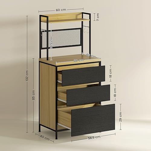 HOMCOM Armoire de Cuisine Buffet Cuisine Meuble de Rangement Industriel avec 3 tiroirs, Plan de Travail, étagère et 4 Crochets, Meuble Micro Onde pour Salle à Manger, Salon, 60x40x132cm, Bois Naturel