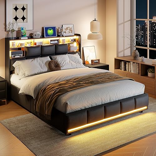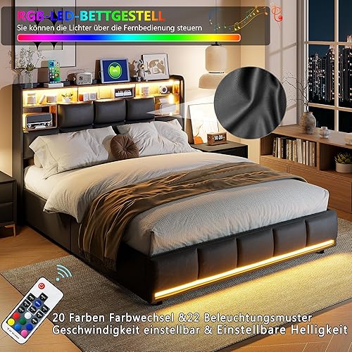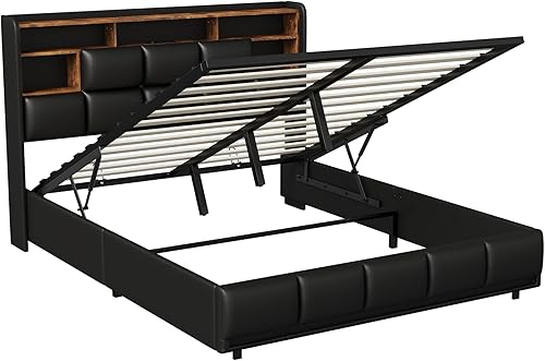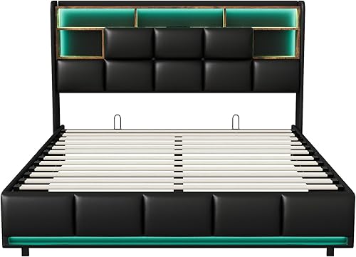 LONELYO Lit Coffre 160 x 200 à LED, Lits Hydraulique avec Étagères Ouvertes et Rangement Caché en Tête de Lits Capitonné, Lit 2 Personnes avec Lattes en Bois