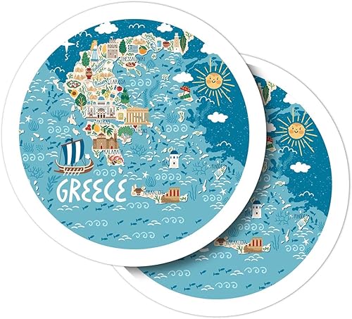 Lot de 2 autocollants ronds en vinyle - 10 cm - Carte de la Grèce touristique, carte grecque, voyage pour ordinateurs portables, tablettes, bagages, scrapbooking, réfrigérateur #58683