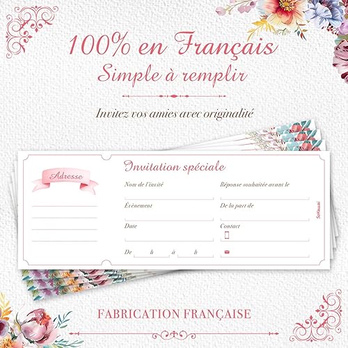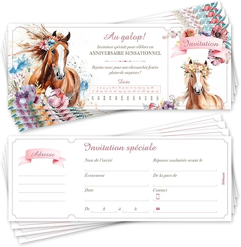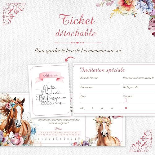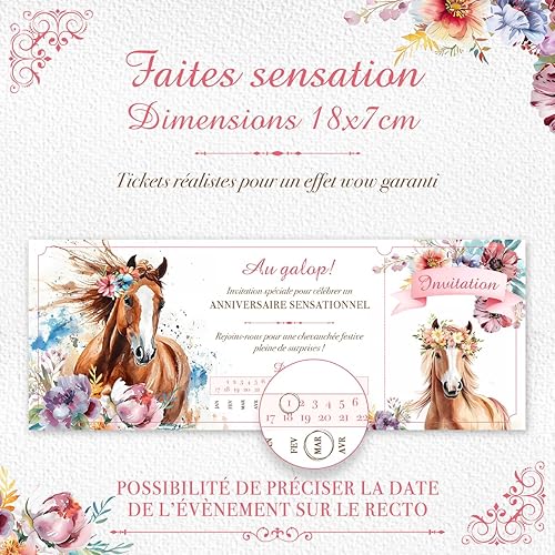 SoKawaï - 12 invitations anniversaire en Français | Thème Équitation - Cheval | Format ticket | Adresse détachable
