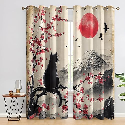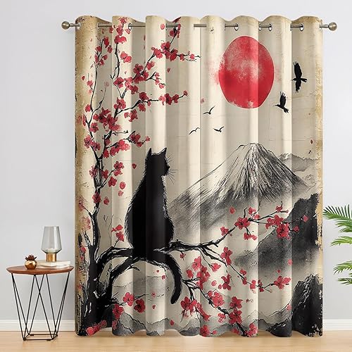 Rideau Occultant Fleurs de Cerisier Chat, Rideaux Motif Japonaise Asiatique, Rideau Thermique Isolant à Oeillets, Rideaux Fenetre Imprimé pour Salon Chambre Décoration, Lot de 2 Draperies, 117x137 cm