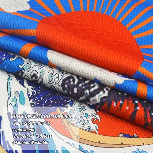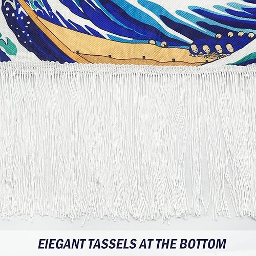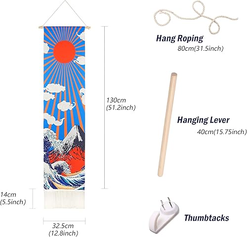 LIGICKY Tapisserie murale japonaise à suspendre avec pompons Ukiyoe Hokusai La Grande Vague de Kanagawa Vague Coucher de soleil Fuji Montagne pour salon, chambre à coucher, dortoir (32,5 x 130 cm)