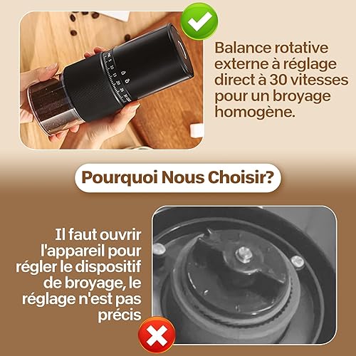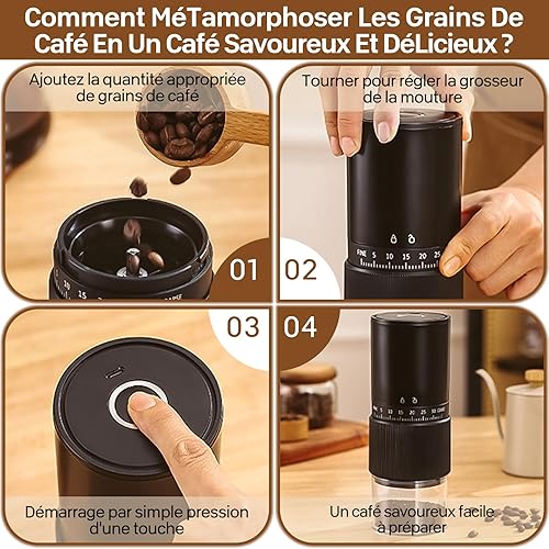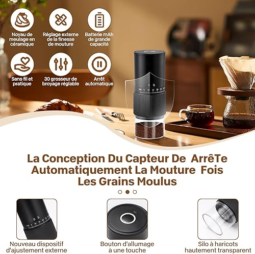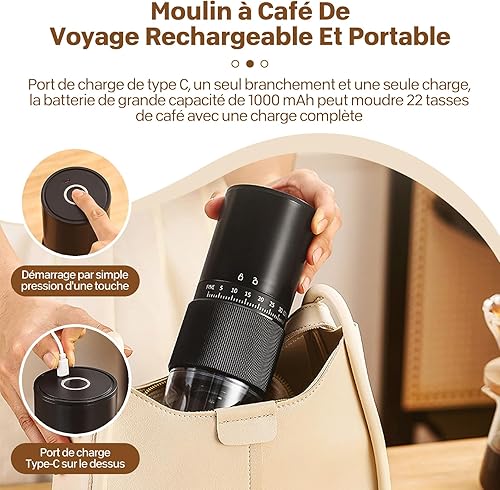 Moulin à Café à Meule Portable, Petit Moulin à Café éLectrique Avec 30 RéGlages, Moulin à Café Sans Fil Rechargeable Avec Meule Conique En CéRamique Et Brosse De Nettoyage Pour Le Voyage Et Le Camping