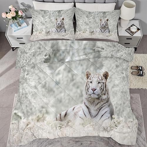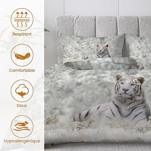 buyluhn Couette 140x200 4 Saisons, Couette Tigre Blanc Imprimée 1 Personne pour Lit 90x190 Enfant Fille Garçon, Edredon Duvet Animal Ete Hiver avec 2 Taies d'oreiller, Lavable en Machine