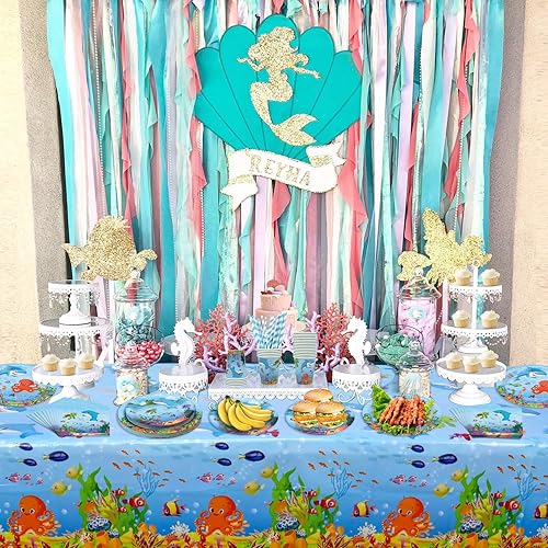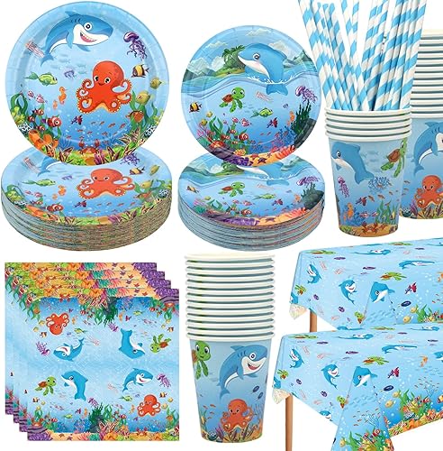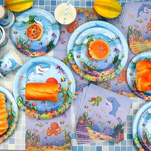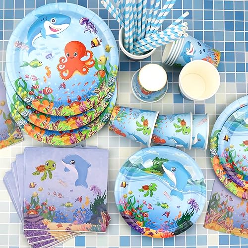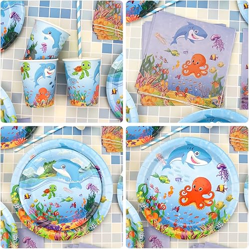 LSJDEER Fournitures de fête sur le thème de la mer - Assiettes à dîner et à dessert Tasses Serviettes de table Pailles pour les décorations de fête d'anniversaire du monde sous-marin, Servir 20