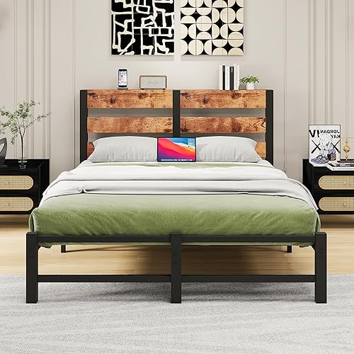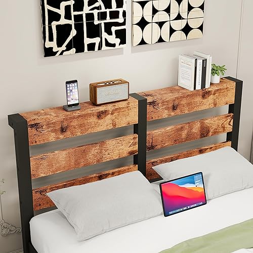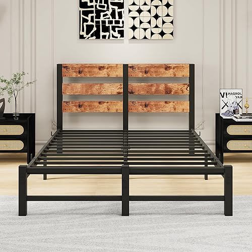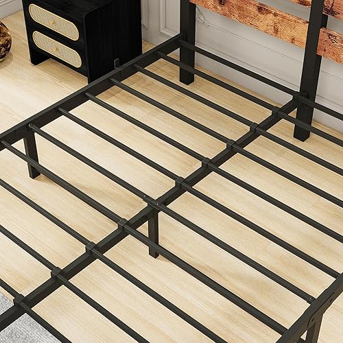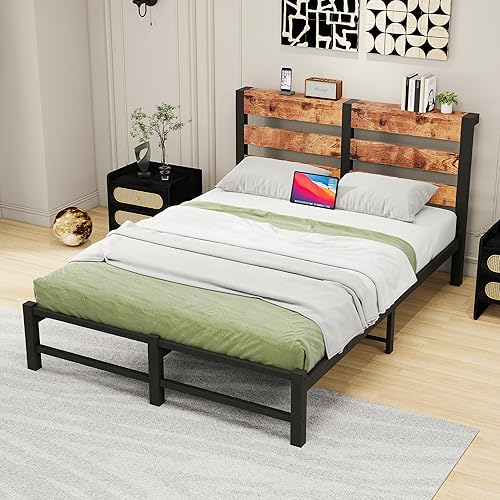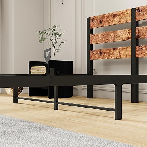 VERFARM Cadre de lit simple en métal, 140 x 200 cm, moderne, pour adolescent, avec sommier à lattes, en bois, avec espace de rangement pour tête de lit, pour chambre à coucher, chambre d'amis, marron