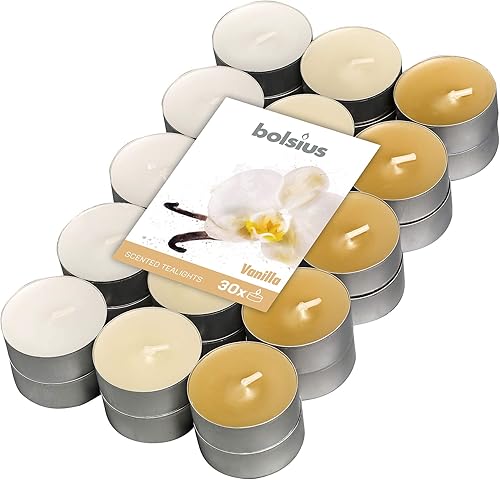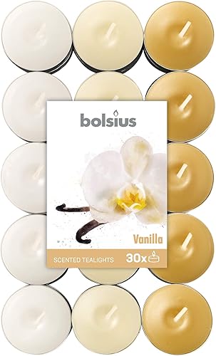 Bolsius - 30 Bougies Chauffe-Plat Parfumées – Vanille - Durée de Combustion de 4 Heures - Diamètre 38 mm - Extraits Naturels - Contient de la Cire Végétalienne - sans Huile de Palme