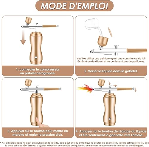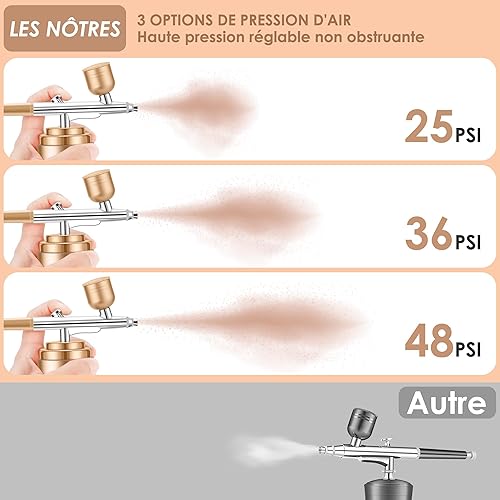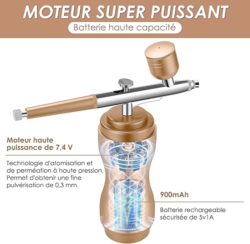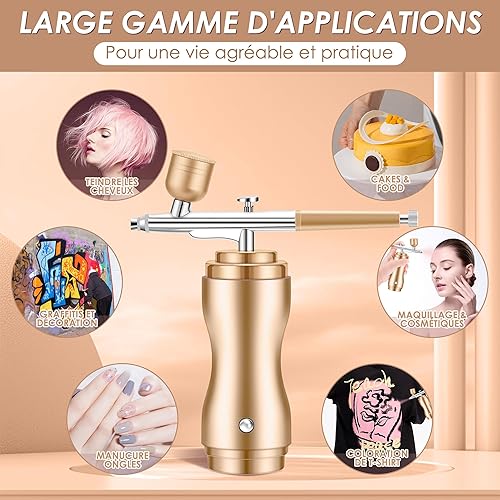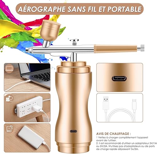 Powate 48 PSI Kit Aerographe avec Compresseur Portable Mini Aérographe Double Action Réglable sans Fil pour Modelisme Peinture Nail Art Gâteaux Tatouage Artisanat,Or