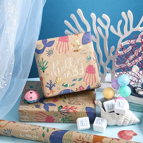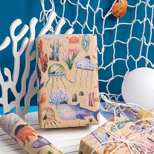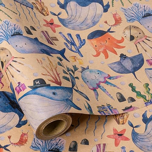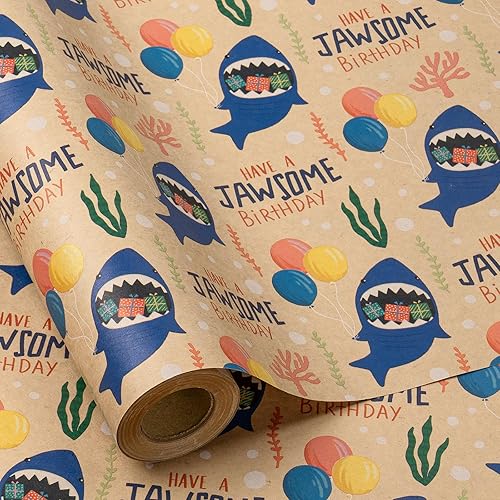 RUSPEPA Rouleau de papier cadeau d'anniversaire pour enfants - Emballage cadeau avec requins, ballons, texte HAVE A JAWSOME BIRTHDAY pour anniversaire de garçons et de filles - 43,2 cm x 5 m