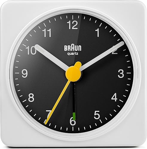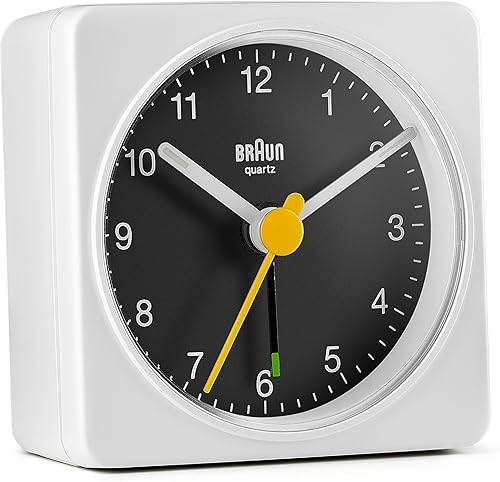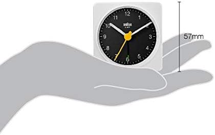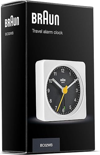 Braun Réveil analogique de Voyage Classique, Taille compacte, Mouvement à Quartz Silencieux, bip de l’Alarme en Crescendo, en Blanc et Noir, modèle BC02WB.