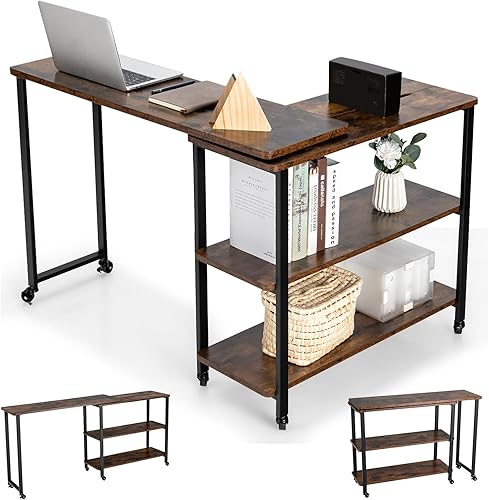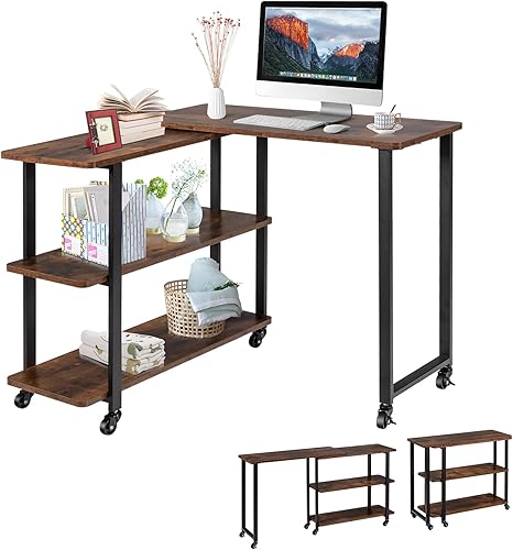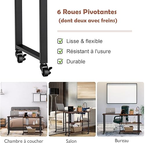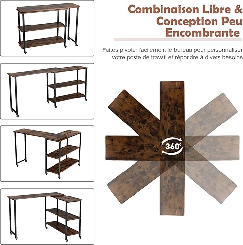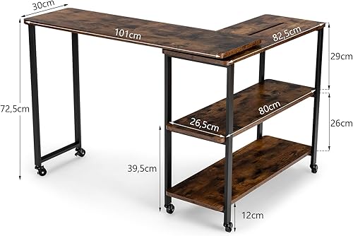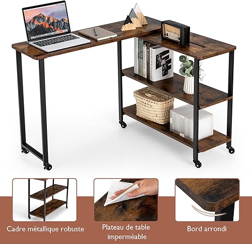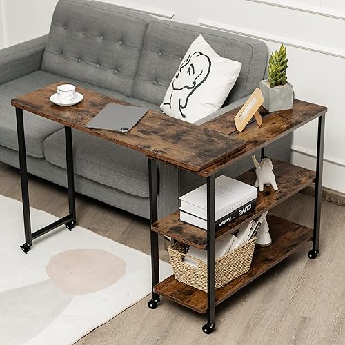 COSTWAY Table d’Appoint, Bureau d’Angle Mobile avec 3 Étagères, Bout de Canapé Convertible pour Salon, Chambre, Montage Facile, Bureau avec Rangement, Marron Rustqiue(L)