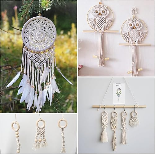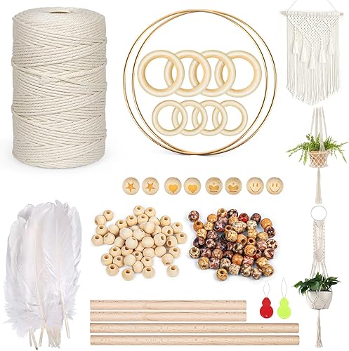 Corde en Macramé 100m,Naturel Fil Macrame 3mm,8 Pcs bâtons en Bois 8 Pcs Anneaux en Bois 108 Pcs Perles en Bois 2 anneaux en métal, kit pour Plante Cintre Artisanat DIY Décoration