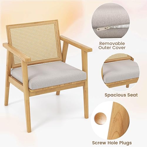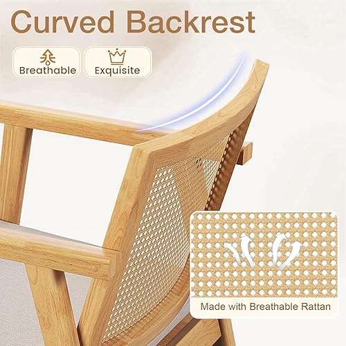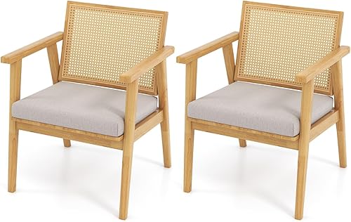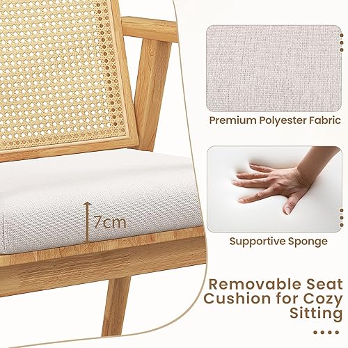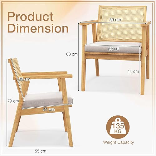 HOMASIS Lot de 2 chaises de salon en rotin avec dossier et accoudoirs, chaise d'accentuation en bois massif, fauteuil rembourré avec coussin amovible, fauteuil de relaxation, charge maximale 135 kg,