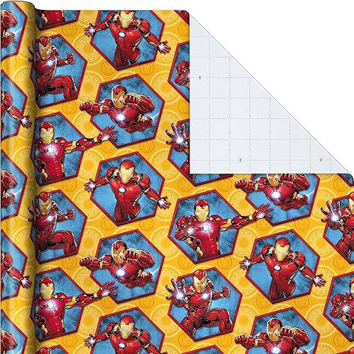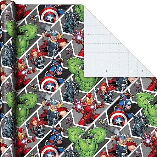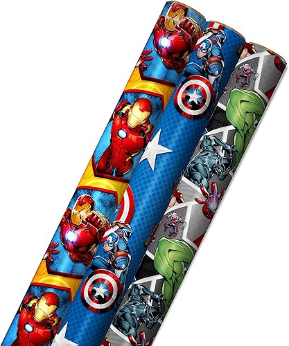 Hallmark Avengers Lot de 3 rouleaux de papier cadeau avec lignes de coupe au verso avec Captain America, Iron Man, Black Widow, Thor et Hulk pour anniversaires, Noël, fête des pères et plus encore