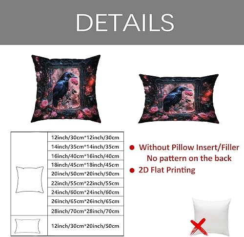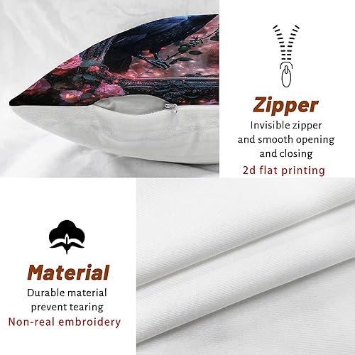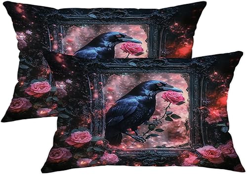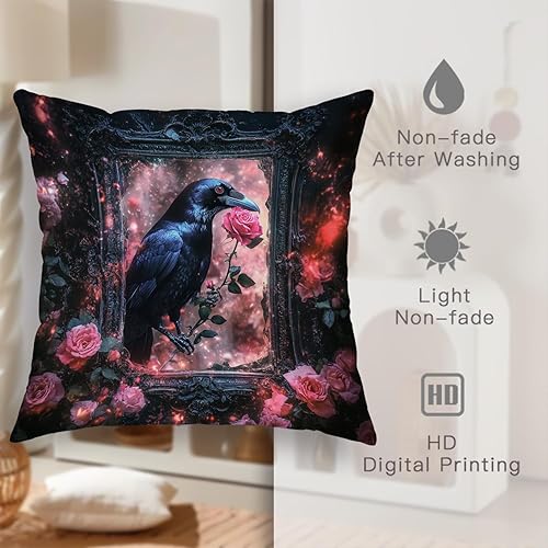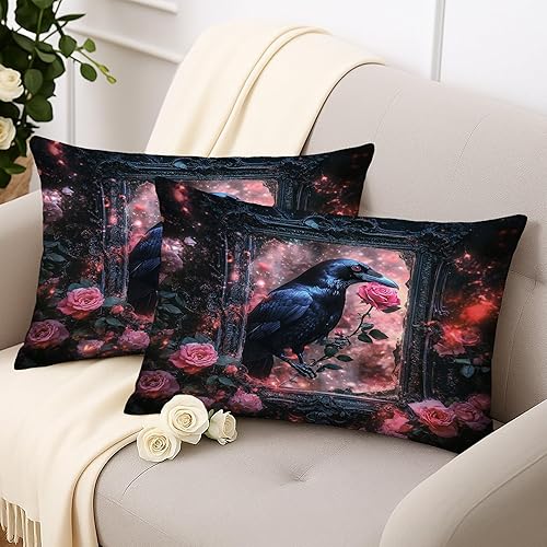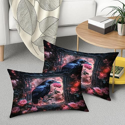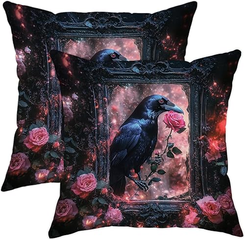 Lot de 2 housses de coussin gothiques motif corbeau noir et rose pêche, décoration d'Halloween et d'automne pour salon, canapé, sofa, style sombre magique, 45,7 x 45,7 cm
