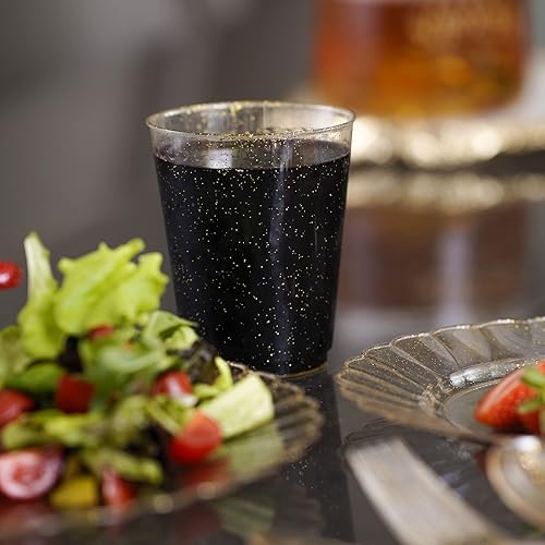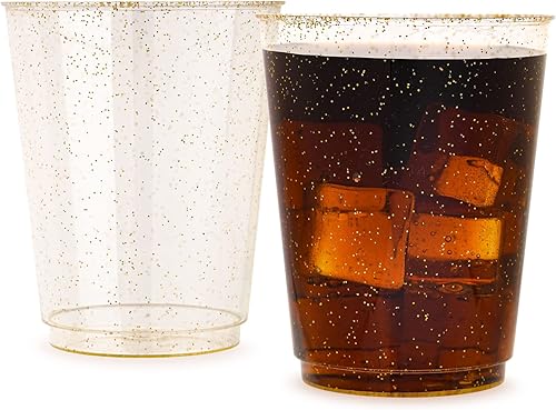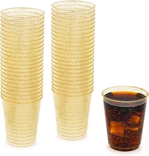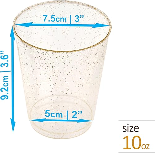 STACKABLES Lot de 50 gobelets transparents à paillettes dorées de 300 ml - Réutilisables et élégants - Multiusage, pour fêtes, mariages, vacances