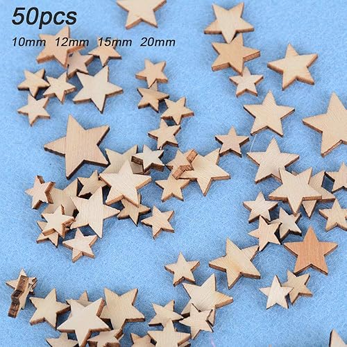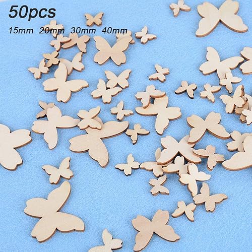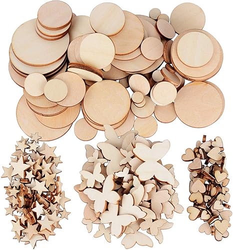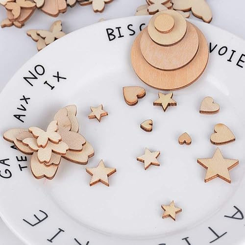 200pcs Embellissement Tranches en Bois 4 Formes (Coeur + Rond + Etoiles + Papillon) Taille Mixte Disque Rondelle de Bois Naturel pour Décoration Mariage Fête Scrapbooking Artisanat Bricolage