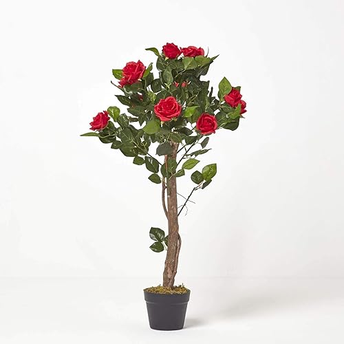 HOMESCAPES Rosier Artificiel Rouge Fleuri en Pot 90 cm