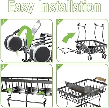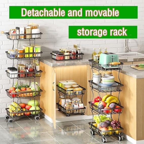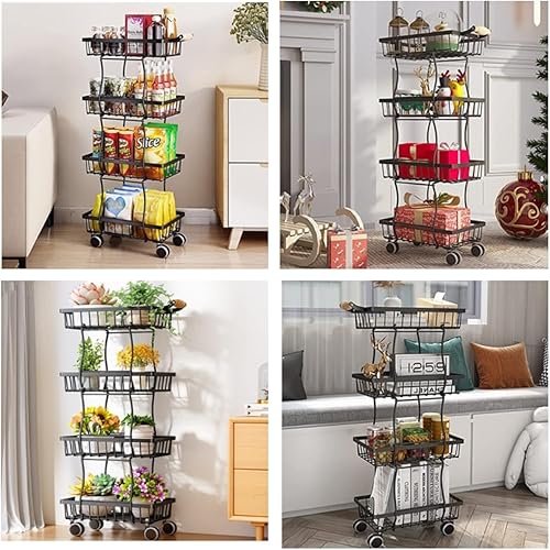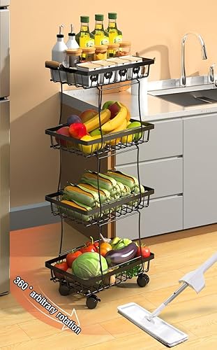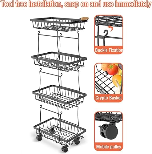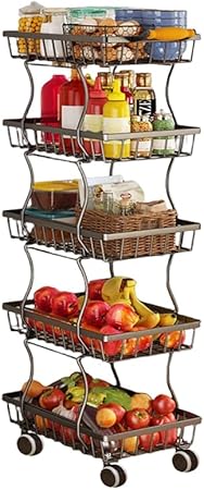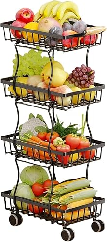 Panier à fruits à roulettes, support fin en fil métallique avec poignée en bois et roues pour cuisine, salon, chambre à coucher et salle de bain, étagère de rangement empilable
