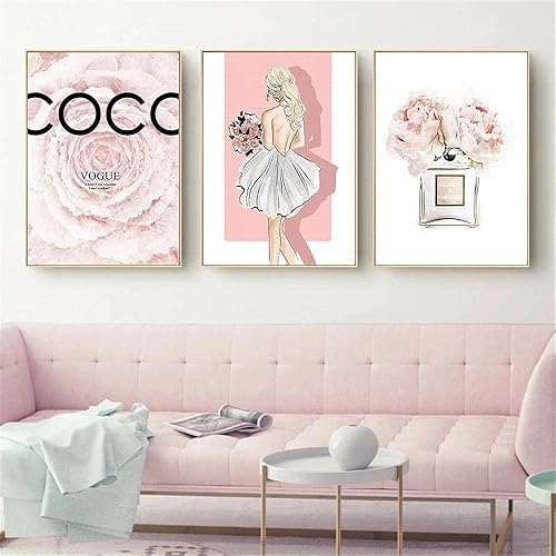 SYXBEIVK Mode Livre Fille Mur Art Impression Sur Toile Affiche De Mode Fleur Rose Pivoine Bouteille De Parfum Mur Photos Salon Décor Peinture-40x60cmx3Pcs-pas de cadre