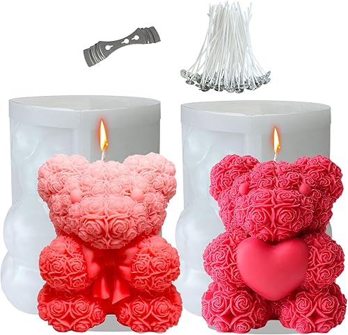 Midnadiy Moules en silicone ours 3D, 2 pièces Moule à bougie ours rose, Moule en silicone bougie ours fleur, Moules à couler, Moules à bougie DIY pour savons faits maison, Cadeaux (M+M)
