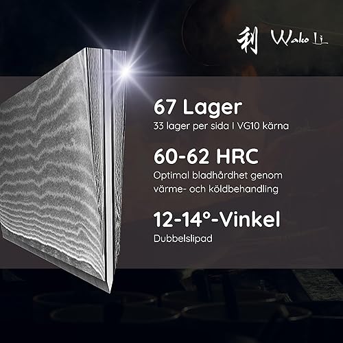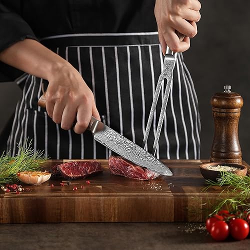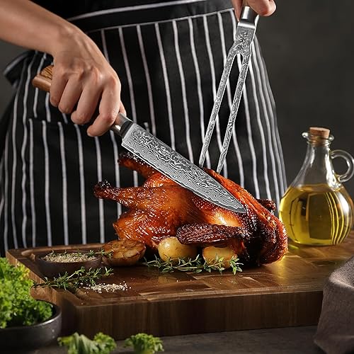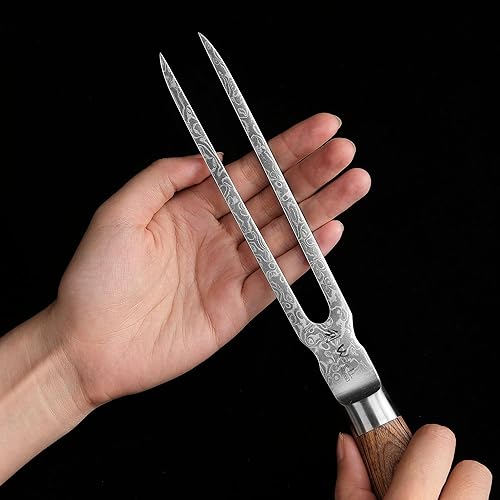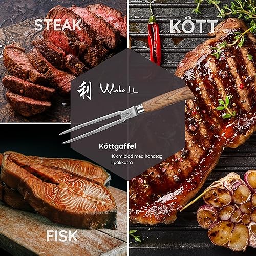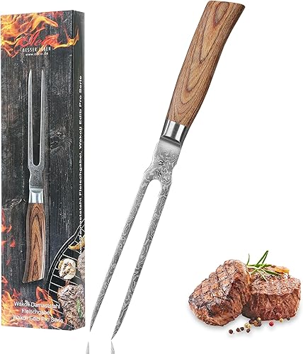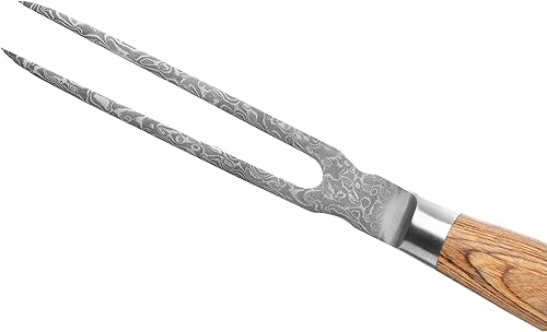 Wakoli Edib Pro Damast Fourchette à découper avec lame de 18cm en acier damassé fabriquée en 67 couches avec noyau VG10 I Fourchette à viande et à barbecue en acier damassé I Manche en bois de pakka