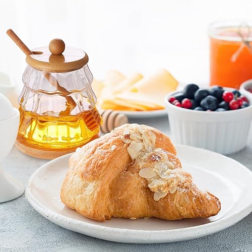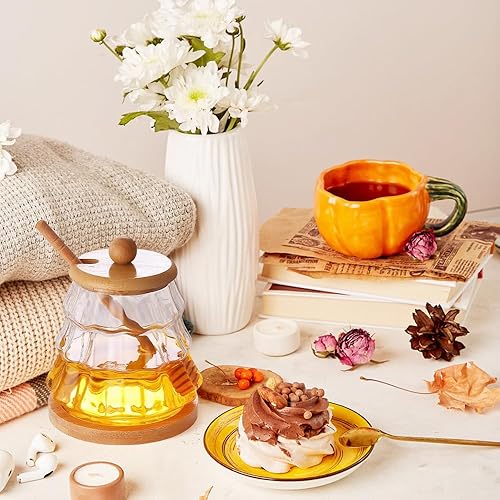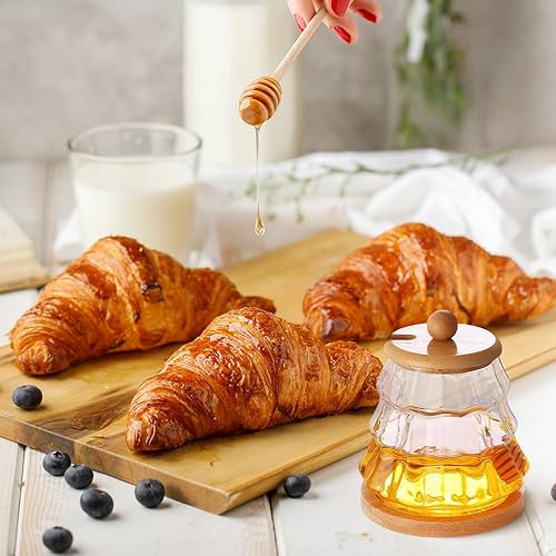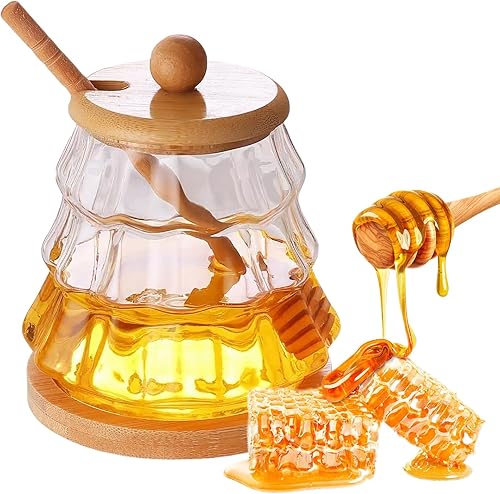 Dzmuero Pot a Miel, 300ML Pot de Miel avec Cuillere en Bois, Cuillère à Miel, Distributeur de Miel, Récipient en Verre Scellé, Pot à Miel à Large Ouverture