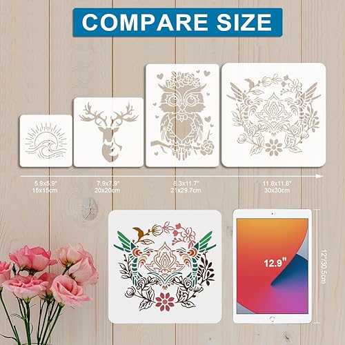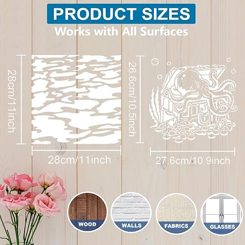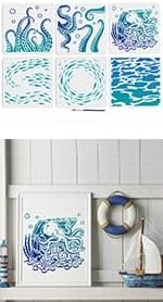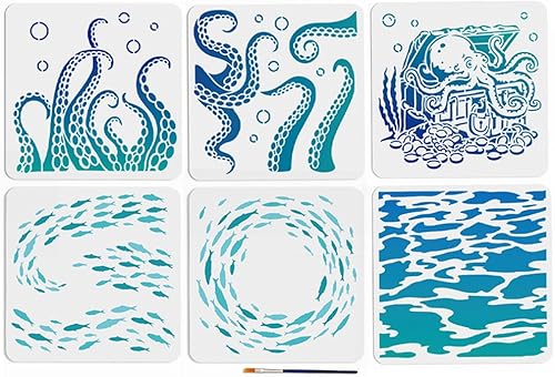 MAYJOYDIY Lot de 6 pochoirs à tentacules d'école de poissons de l'océan, 30 × 30 cm, grands pochoirs de peinture sur le thème de la mer d'été avec pinceau, créatures marines, pieuvre, pour bois,
