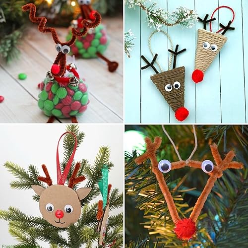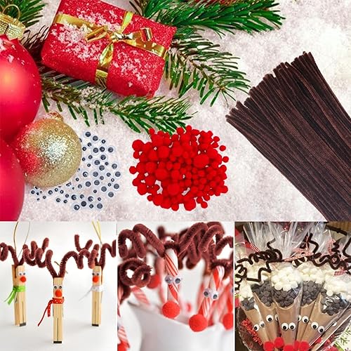 SCLLNDA 830 Pièces Fils Chenille Kit 150PCS Marron Fil Chenille Cure Pipes 360 Yeux Mobiles Autocollants 320 Pompons Rouges pour Artisanat DIY Noël Rennes