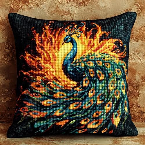 Kit Coussin au Point Noué, Flamme et Paon Tapis Point Noué Kit,Kits de Crochet de Verrouillage for Débutants Bricolage,43x43cm