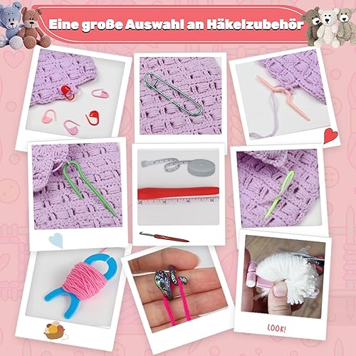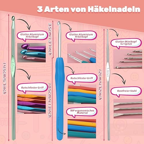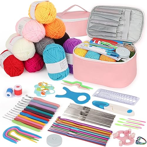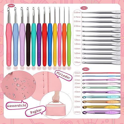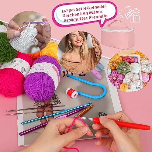 Aeeque 82 pcs Kit Crochet Débutant Complet Adulte, 12pcs 0,6-1,9mm Aiguille à Crochet pour Dentelle, 12pcs Crochet Ergonomique, 12pcs Pelotes de Laine pour Crochet Tricot, Crochet Kit(Sac Rose)