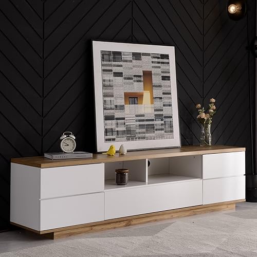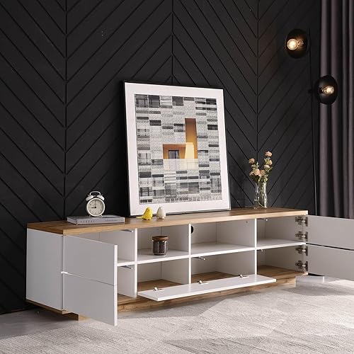 KOMHTOM Armoire de rangement pour TV en blanc et bois, buffet avec cinq portes et deux compartiments ouverts, armoire polyvalente robuste et lisse pour le salon et la chambre à coucher (B)