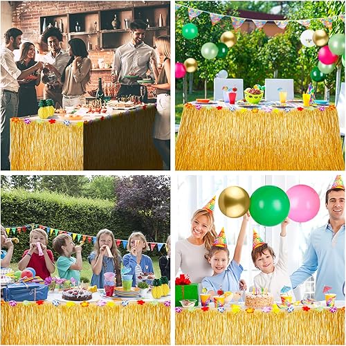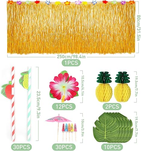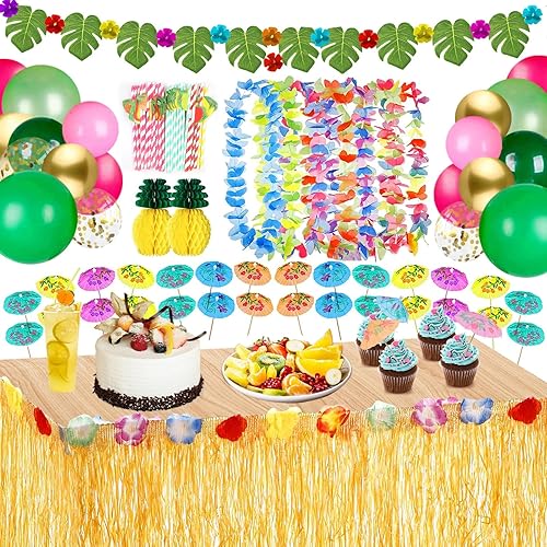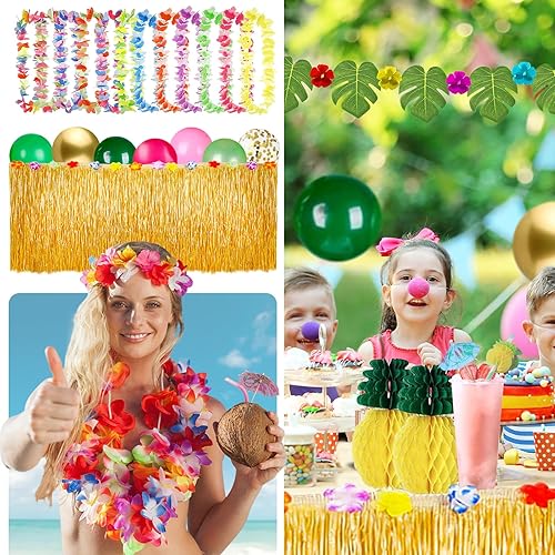 YAOYIN 118 Pcs Hawaïenne Luau Table Jupe Set de Décoration, Decoration Anniversaire Tropical, Feuilles de Palmier, Collier Fleurs Hawaïenne, Ballons, pour Beach Décorations de Fête à Thème Hawaïenne