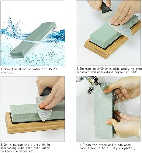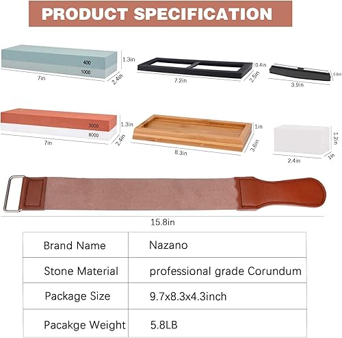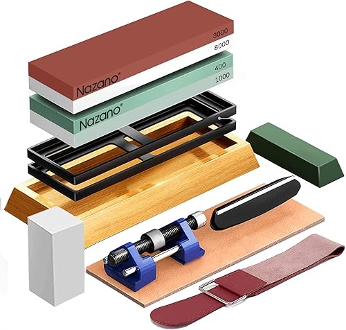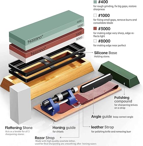 Nazano Pierre à Aiguiser 11 pièces – Aiguiseur Couteaux Professionnel, Pierre à Affuter 4 côtés 400/1000 3000/8000 avec Base en Bambou Antidérapante, Pierre à Aplatir, Cuir, Guide d'angle
