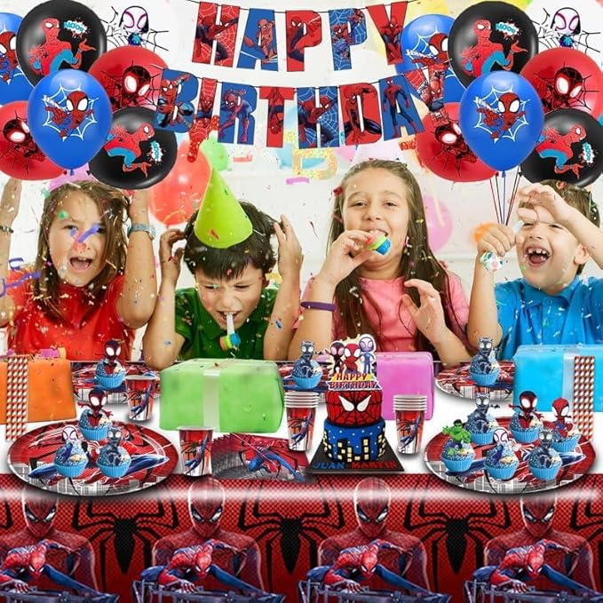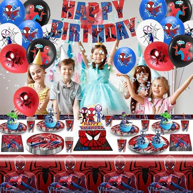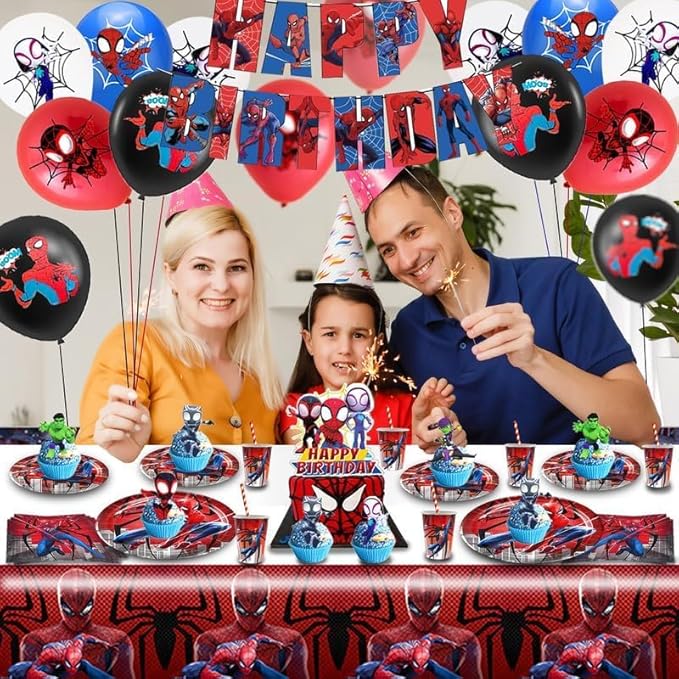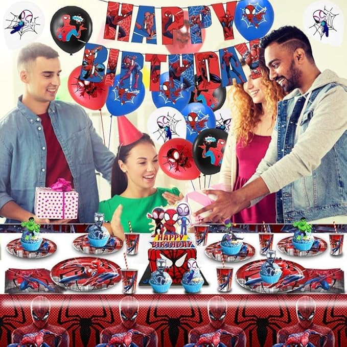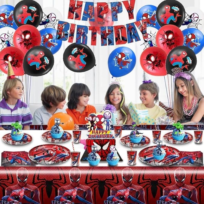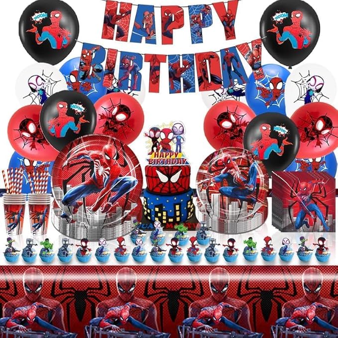 Spider Anniversaire Vaisselle 103 Pcs,Vaisselle de Fête Spider,Enfants Anniversaire Décoration,Ballons,Assiettes,Tasses,Nappe,Serviettes,Décoration de Gâteau,pour Enfants Fêtes Fournitures,10 Invités