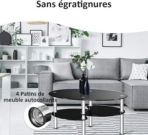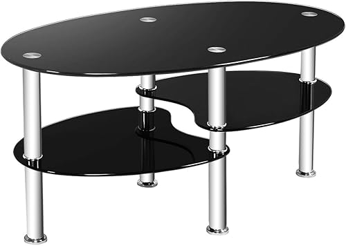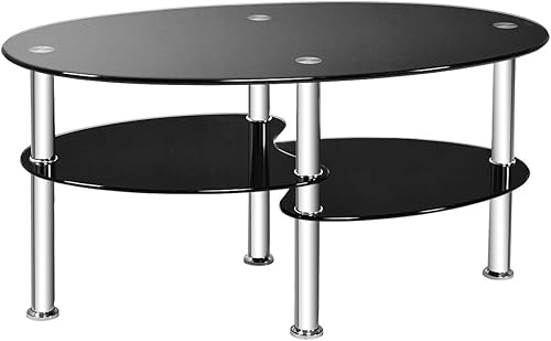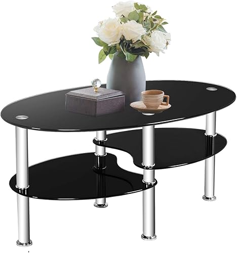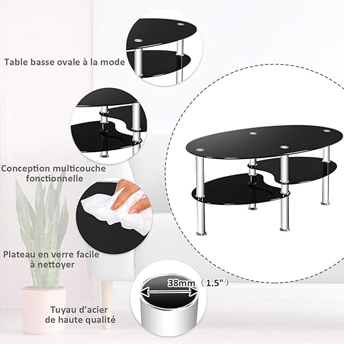 COSTWAY Table Basse en Verre Transparente avec 3 Etagères en Verre Trempé, Table Basse Salon Ovale pour Salle, Salon, Chambre, 90x50x45cm