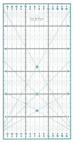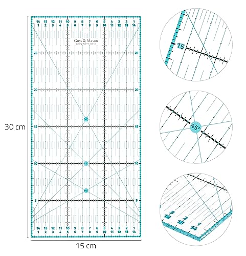 Guss & Mason règle patchwork 30 x 15 cm avec autocollants antidérapants offerts. Règle couture universelle transparente avec graduations en cm et indications d'angles