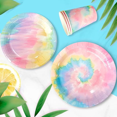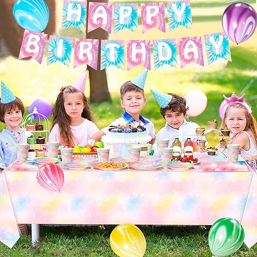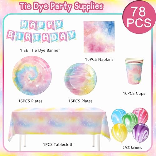 Fournitures de Fêde Tie Dye - 78pcs Set de Décorations & Vaisselle de Fête Tie Dye,Ballons de Fêtes sur le Thème Bannière Assiette Serviette Nappe etc Vaisselle de Fête à Thème Tie Dye pour Filles