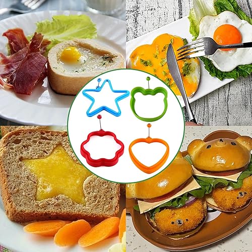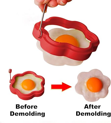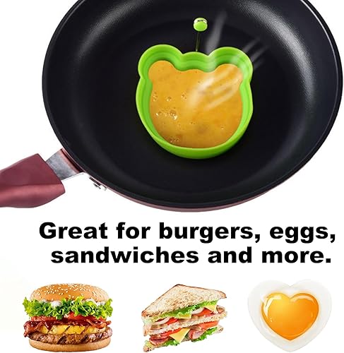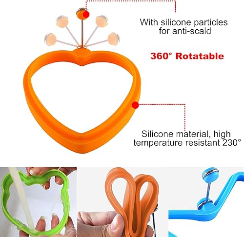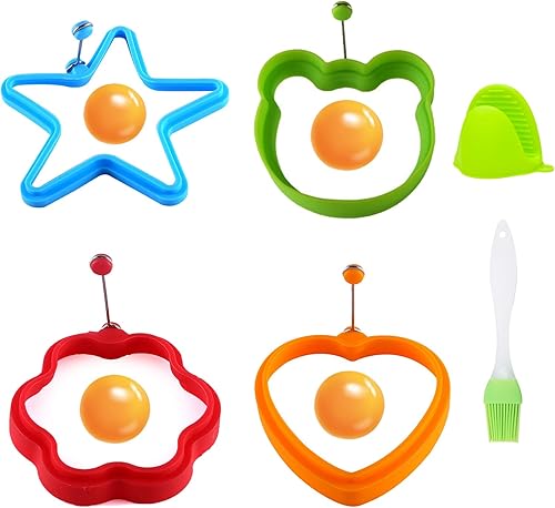 KASESSS 6 Pièces Moule Oeuf Au Plat Set, Silicone Anneaux D'oeufs, Anneaux D'oeuf Antiadhésifs, Multi-Style Moule Pancake avec Poignée Anneau à Oeuf Silicone avec Brosses à Huile et Gants Anti-Brûlure