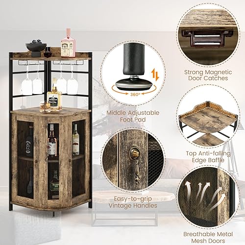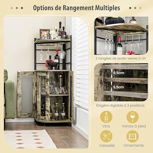 GOPLUS Armoire à Vin d'angle Style Industrielle avec Étagère Réglable et Porte en Maille, Meuble de Rangement avec Porte-Verre à Vin, Armoire de Rangement sur Pieds pour Bar, Cuisine, Salon
