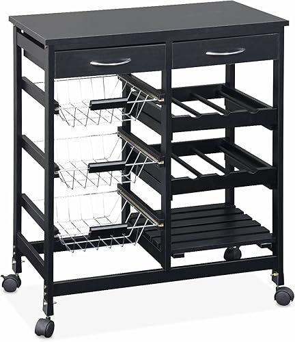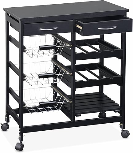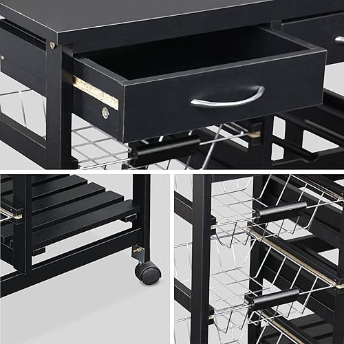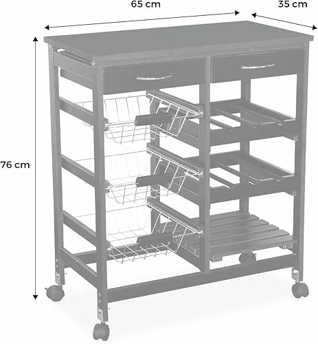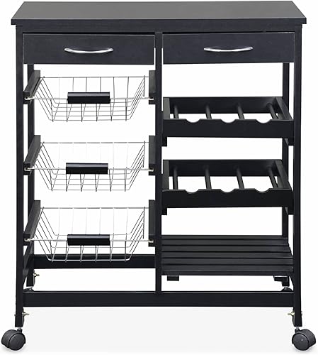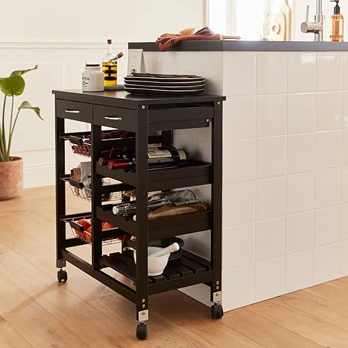 Alice's Home - Desserte de cuisine noire. chariot à roulettes - Charlotte - 2 tiroirs. 3 paniers. 2 étagères range bouteilles. 1 étagère