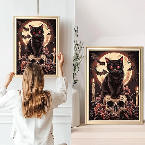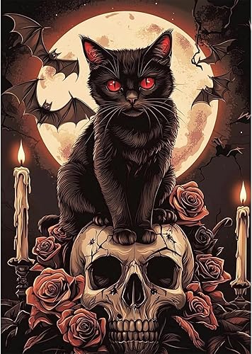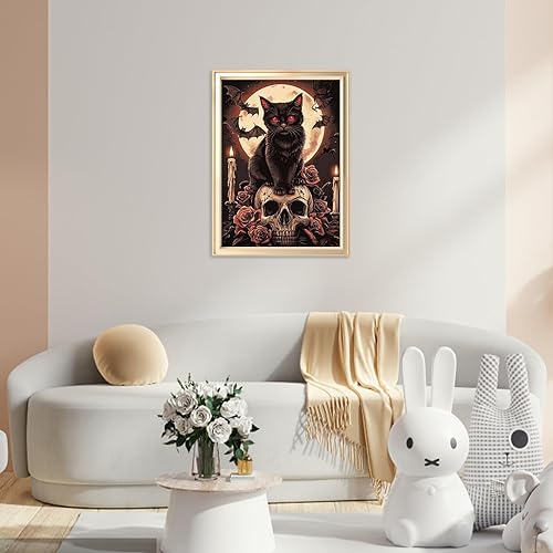 QENSPE Halloween Diamond Painting Kit pour Adulte Débutant, Chat Noir Crâne Peinture Diamant, 5D Ronde Diamants Painting Image pour Décoration Murale Maison Cadeau 30x40cm