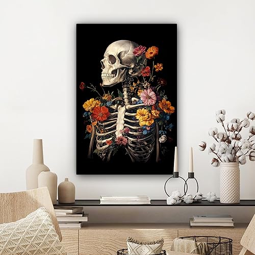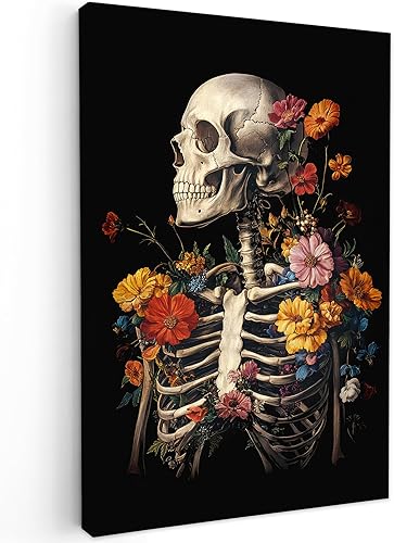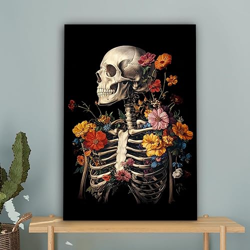 MuchoWow© Impression sur Toile Peinture 40x60 cm Tableau Mural Decoration Salon Reproductions de Tableaux Murale Moderne Squelette - Fleurs - Crâne - Coloré